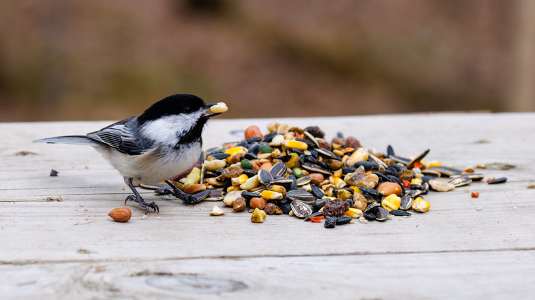 One nice feature about this type of feeder is that it'll hold any variety of bird seed, including the various seed and nut blends favored by chickadees, nuthatches, and blue jays. Add chia seeds to your bird feeder with any birdseed blend for to boost bird nutrition. Since the jar is transparent, you'll easily know when the feeder needs refilled, too. It's also easy to clean this bird feeder from time to time, as the base portion comes apart and the whole thing only consists of two parts.
