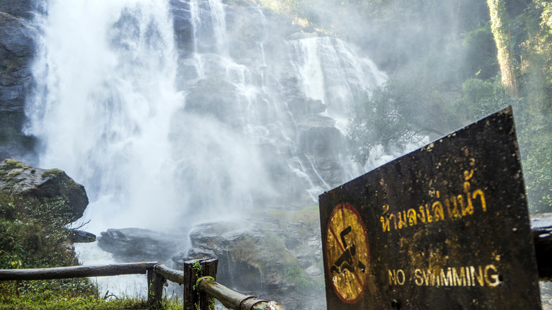 Once you do reach the water, don't automatically assume you can swim there. In fact, the water at the base of many waterfalls is off-limits to swimming. Before entering the water, first be sure it is actually allowed. Even if you are able to get into the water, be aware of the often strong currents, as well as underwater objects. Never attempt to exceed your own abilities by entering areas that you are unsure of. Additionally, never jump off falls into the pools below. The water in these pools may be shallower than you realize, have unseen objects scattered around, or have currents that make it difficult to surface.