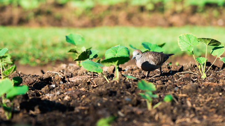 Most bird species tend to avoid landing somewhere with shiny, reflective surfaces, and sudden movement and noises can make a landing spot unappealing to your feathered friends. As a result, while you may want to avoid these features if you're trying to build a yard that birds flock to, utilizing light and sound can be a great, harm-free way to keep birds out of your seedlings.