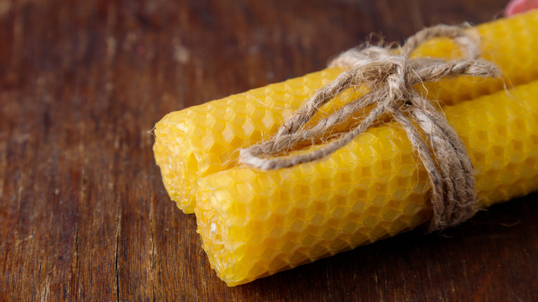 Using beeswax in any other form, such as bars, candles, sheets, or pellets, takes a few additional steps. One common method is to melt the beeswax in an old saucepan, then brush it on the material you'd like to waterproof. Another way to do it is essentially the opposite. Start by rubbing beeswax all over the material, then use a heat source to melt it into the material. When working at home, a hair dryer can accomplish this. When in the field, a lighter, propane torch, candle, or campfire can be used. Yet a third method combines the two. This involves melting the wax before applying, then heating it again after it dries on the fabric.