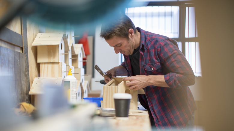 When you're happy with the design you've created, use a outdoor adhesive like Loctite landscape adhesive to attach each tile. After the adhesive dries fully, you can move on to grouting. Don't be afraid to play with color at this point, using grout that either complements or contrasts your tiles for an eye-catching appearance. Let the grout sit five minutes before wiping, and your stylish birdhouse is ready to give someone a home.