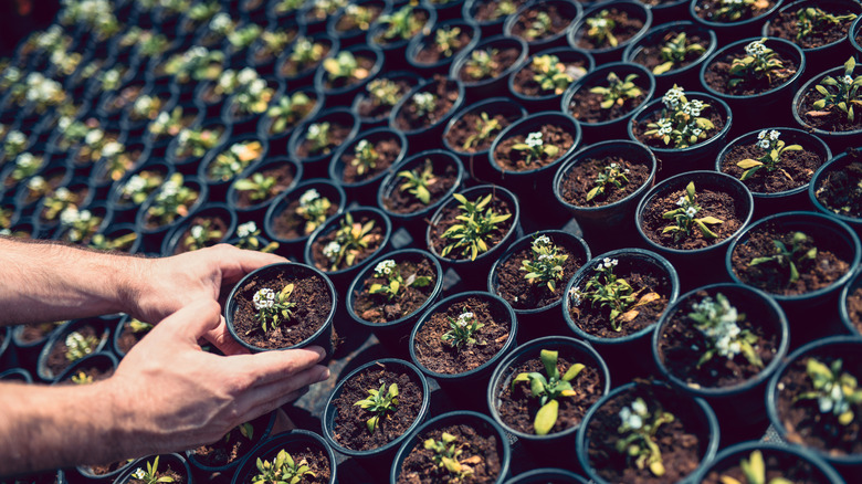 Once this is done, you can begin adding the plants you want to your new tiered planter. Ideally, you'll want to choose plants that do well in hanging baskets, like wishbone flowers. From there, the plant you choose will dictate how high-maintenance this stylish container garden is. However, since it's going to be hanging, we suggest you go with something that's more hands-free. This is especially true given that plants on the second tier may be hard to reach without either getting a step stool or taking your hanging planter down for care.