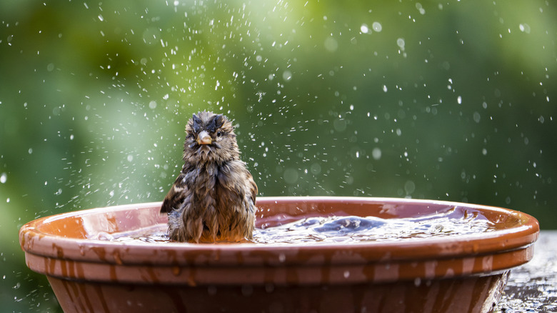 Choose a suitable vessel for a birdbath basin; the goal is a basin that's somewhat wide but shallow and that has a completely flat bottom so it won't tip when birds or squirrels visit. DIYer Kelly Elko uses a plant saucer in her original take on the idea. Texture in the birdbath makes birds more comfortable, so go for anything with texture in it as a first choice if you have several bowls to consider. If you can't find a vessel with texture on the inside, a medium-sized plant saucer or even a pie pan will do. Just add a couple flat rocks so the birds have a place to stand without slipping. Set the basin atop the ladder, add water, and it's ready for splash time. To enhance the garden vibe even more, add a small potted plant or two to any exposed flat steps on the ladder, as Elko did.