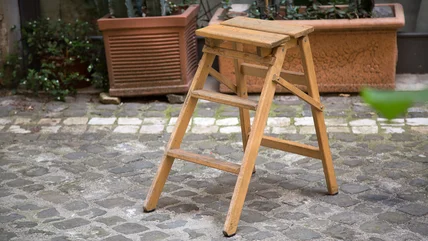 To transform a stepladder into a stand for the birdbath basin, first wiggle it a bit when it's fully open to ensure it's fairly stable. A slight wobble is okay for a short step-stool-style ladder, but it isn't ideal for a tall stepladder. If using a vintage wooden stepladder, wipe off any dirt, allow it to dry, then coat it with a sealant designed for outdoor use. Several coats of an exterior latex paint can be used instead if you'd like to give the ladder a fresh color. Once it's completely dry, select a flat area on the patio or even in a flowerbed. Skip a sunny location for the birdbath if possible, as the water will stay cooler and more algae-free in the shade.