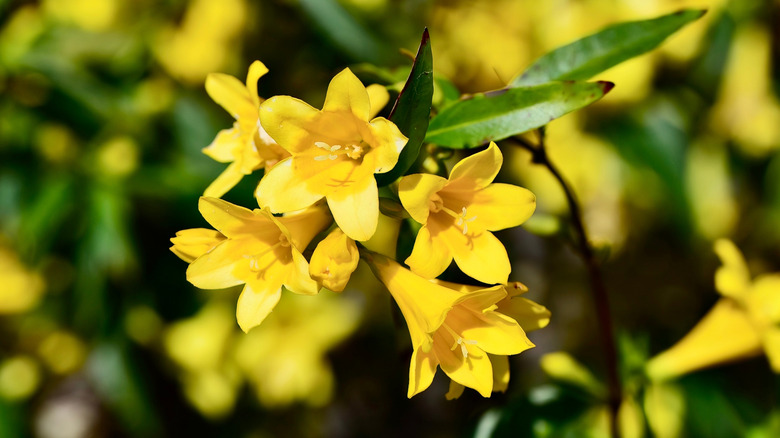 Sometimes called yellow jessamine or false jasmine, Carolina jessamine is best suited for USDA hardiness zones 6 through 10. It's as tough as it is pretty, withstanding saline soil, brief droughts, and temporary sogginess. This glossy-leaved plant is often found in woodlands, where it likes to climb trees. In yards, Carolina jessamine is fond of scaling trellises, fences, pergolas, and other vertical surfaces. Strands of vine twist around each other as the plant ventures skyward. When rarely pruned, Carolina jessamine may grow as tall as 20 feet and as wide as 30 feet. If you choose to trim it, wait until flowering process has finished before breaking out the shears. Carolina jessamine will form a dense ground cover if no structures to climb are nearby. This can control weed growth in the summer and provide shelter to wildlife in the winter.