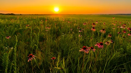 The middle of America was once covered in a vast landscape of waving grasses, colorful wildflowers, grazing bison, and birdsong. Undulating hills of bluestem, switchgrass, and Indiangrass growing 3 or more feet in height – peppered with purple coneflower, prairie larkspur, butterfly milkweed, and other native wildflowers — extended as far as the eye could see. This unique ecosystem, known as tallgrass prairie, once stretched from the Canadian border south to Texas, and from Indiana west through Nebraska and Kansas.