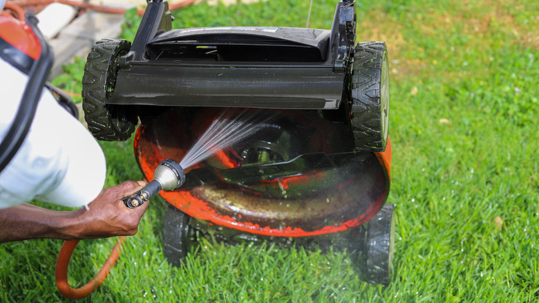 A quick and easy way to remove the dust and dry grass clippings is to blow the mower with compressed air. You can also use a leaf blower or firm bristle brush to complete this task. Of course, you can also use a water hose to spray the grass off. If the grass clippings beneath the mower deck are wet, a hose will usually be necessary. You may have to physically remove some clumps of grass with your hands, a brush, or plastic scraper. Be sure to disconnect the spark plug before reaching under the mower deck and let the mower dry completely before putting it away.