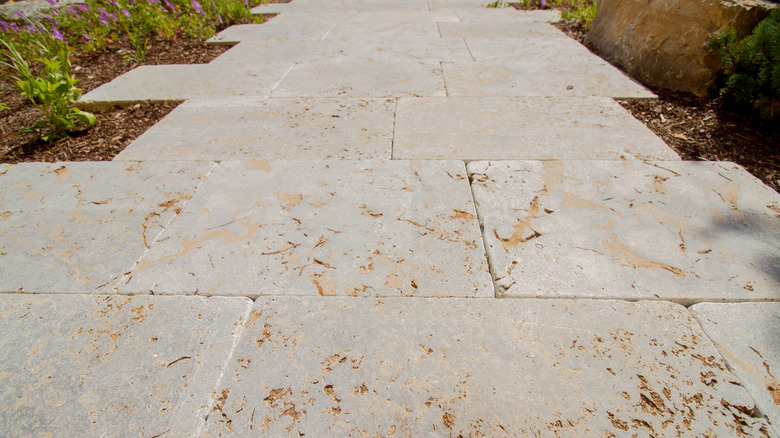 Limestone pavers come in natural stone slabs, quarried from sedimentary rock that's often infused with ancient shells and fossils. It can also be found in a reconstituted version made from crushed limestone, which runs a bit cheaper. Depending on the look you're going for, you can find large 24" x 24" limestone pavers all the way down to 6" x 6" brick-shaped pieces, giving you endless possibilities to design your own unique pattern. Color choices range from creamy white or beige to dark gray, and there's even black for a modern look. Many homeowners appreciate the natural, rustic-yet-elevated aesthetic of the stone. It also stays cool in hot weather, making it a great choice when rainy days give way to sun.