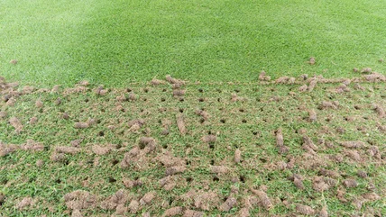 There are many benefits to aerating your lawn. It often allows your grass to develop stronger root structures, which improves its drought toleration, and results in a denser lawn. Aerating can also prevent erosion and aid with drainage. In combination with dethatching, it is one of the simplest ways to remove standing water from your lawn. You can also aerate to help control moss in your lawn. While aeration tools are easy to pick up at the hardware store or online, you can always DIY an aeration tool with items you already have in your garage. Then all you need to know is the best time to aerate based on your grass type.