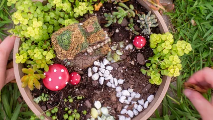 When the surface of the potting mix is an inch or two below the container's lip, lay out your enchanted scene. You might incorporate a small cottage, a bridge or bench, a stepping-stone path, and a welcome sign, plus characters, like little animals and sprites. Make sure to find homes for your plants as you map everything out. Then, push the figurines into the soil slightly and dig small holes for each of your succulents. Carefully insert the plants into the holes, making sure to handle their roots gently.