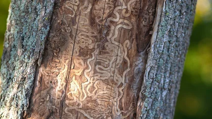 The U.S. Department of Agriculture tracks the emerald ash borer and even has an online map you can check to see if your local county has a known infestation. However, if you're outside looking for tell-tale signs, an ash tree with a beetle problem will have areas of split or missing bark, with grooves snaking through the soft wood underneath and "D-shaped" exit holes from the grooved area. The grooves are not made by adult beetles, which simply nibble on the green leaves of the ash. Instead, emerald ash borer larvae are the big problem, tunneling through the soft wood and eating the inner layers. They impact the tree's ability to circulate nutrients and water, leading to eventual death. Infected trees will also show signs of thinning branches and dying crowns, and they may be riddled with woodpecker holes.