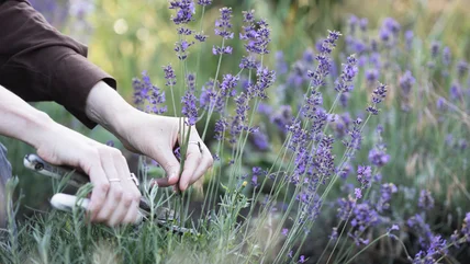 To prune your lavender, all you'll really need is a pair of clean, sharp pruning shears, such as the Fiskar's Bypass pruning shears, and a pair of gardening gloves to protect your hands from this abrasive plant. Before you launch into snipping and cutting, assess your plants and determine where you should cut. A good rule of thumb is to cut back a third of the plant. However, this can vary. What you should focus on is where the woody section ends and the soft, green growth begins. Unless it is dead or damaged, you shouldn't cut into the woody part, as lavender won't grow on old wood. Make sure your shears are clean and sanitized, to avoid spreading mildew or disease to healthy plants. Bleach-free Clorox wipes is one option as they make disinfecting gardening tools a breeze.