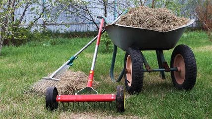 The first and most obvious step to take after dethatching is to clean up and remove the thatch and any other debris from your yard. If it is not removed, this dead material can prevent the remaining healthy grass from getting enough sun and air. Depending on the amount of thatch you have removed, this can be done with either a leaf blower or rake; you can also use a lawn sweeper if you have a very large area to clean up. If using a rake to collect the thatch, be sure to use a soft-tined leaf rake and not one with rigid tines used for dethatching, which would harm the remaining grass.