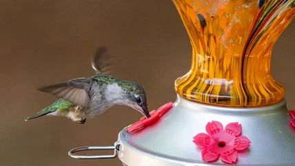 This canopy DIY offers a lot of room for creativity. It doesn't have to be flat: A red plastic colander turned upside down is another way to provide cover. Or loop wire through the top of a mini umbrella for a clever, cute, and colorful way to protect the hummingbird feeder (the feeder will suspend from the crook). An upside down plastic bowl or old pie tin could also work. Hummingbirds are attracted to red and similar colors such as orange and pink, so these colors on a feeder cover could capture the hummingbirds' attention. If you have two nectar stations next to one another, keep the hummingbird feeders conflict-free with a similar DIY structure that features a canopy and a suspended wall to separate the feeders.